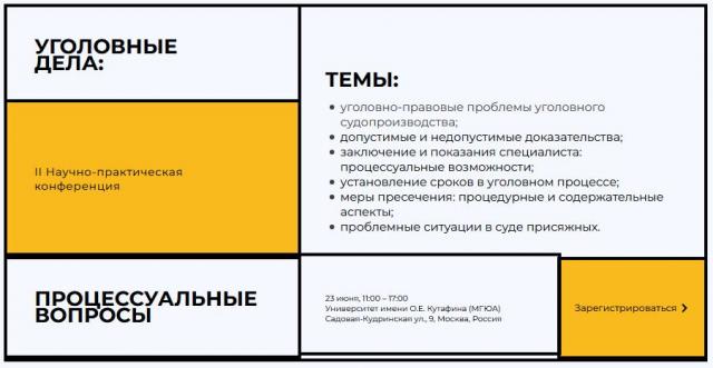 23 июня 2021 года в Университете имени О.Е. Кутафина (МГЮА) в дистанционном формате прошла II научно-практическая конференция "Уголовные дела: процессуальные вопросы". Модератором выступил преподаватель кафедры практической юриспруденции, старший партнер адвокатского бюро «ЗКС» Андрей Гривцов, а «провокаторами» стали: советник уголовно-правовой и общей практики Alliance Legal CG Ксения Амдур, доцент кафедры уголовного права, кандидат юридических наук Арсений Бимбинов, доцент кафедры уголовного права, кандидат юридических наук Вячеслав Воронин, преподаватель кафедры практической юриспруденции, партнер московской коллегии адвокатов «Князев и партнеры» Владимир Китсинг.