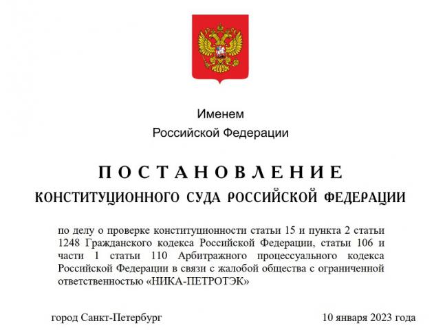 Конституционный Суд РФ опубликовал свое Постановление от 10 января 2023 г. N 1-П “По делу о проверке конституционности статьи 15 и пункта 2 статьи 1248 Гражданского кодекса Российской Федерации, статьи 106 и части 1 статьи 110 Арбитражного процессуального кодекса Российской Федерации в связи с жалобой общества с ограниченной ответственностью "НИКА-ПЕТРОТЭК" (URL: http://doc.ksrf.ru/decision/KSRFDecision656676.pdf)
