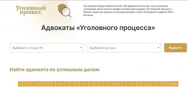 На портале https://advocates.ugpr.ru/ можно искать практику по статье Уголовного кодекса РФ и региону. Доступен список адвокатов по первой букве фамилии. По каждой позиции можно открыть описание уголовного дела, контакты адвоката, его фамилию, имя отчество и фотографию.